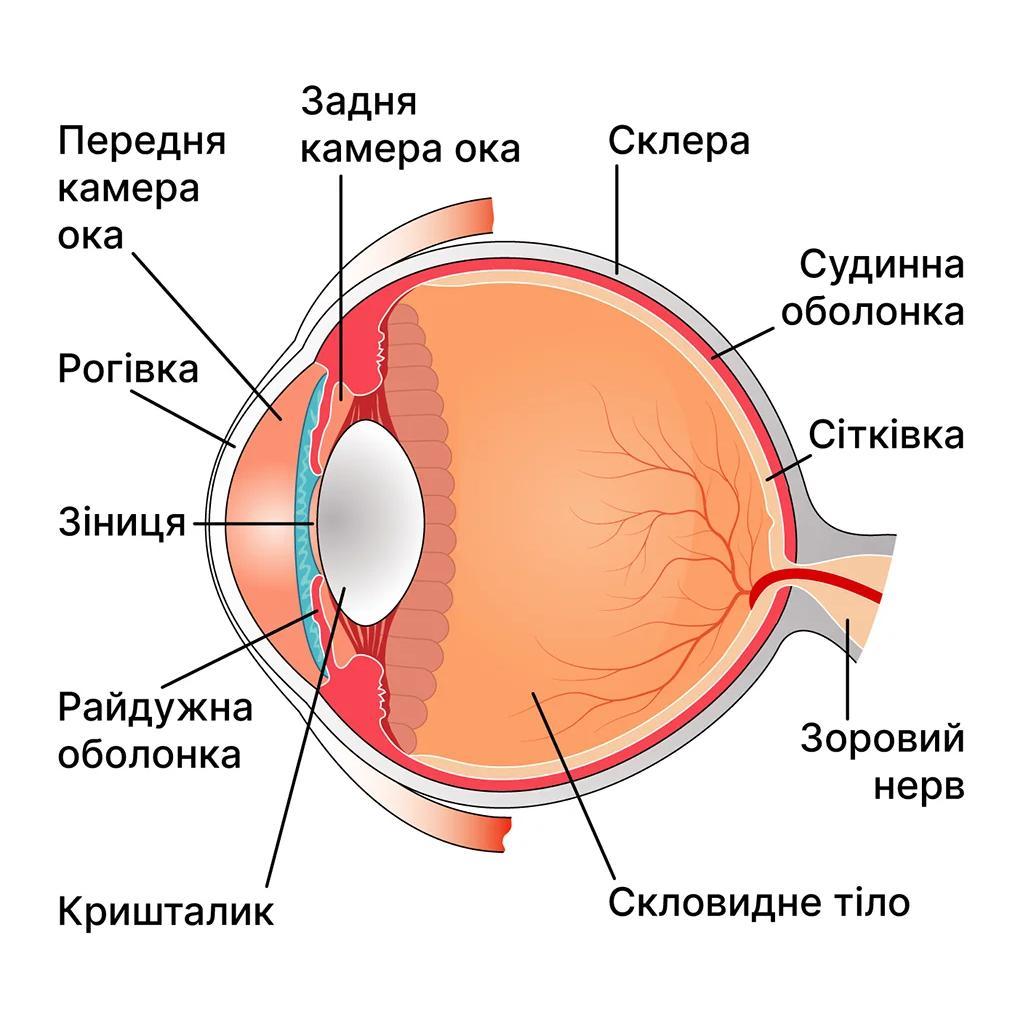 Людське око є одним з найважливіших інструментів сприйняття світу для людини. Воно складається з кількох ОСНОВНИХ складових частин, включаючи рогівку, зіницю, стеклянне тіло, сітківку і зоровий нерв. (На малюнку бульш детальна будова ока)