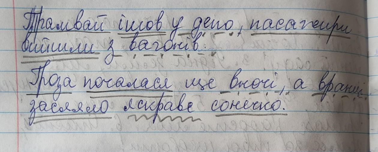 Гроза почалася ще вночі, а вранці засяяло яскраве сонечко. (на фото підкреслено)