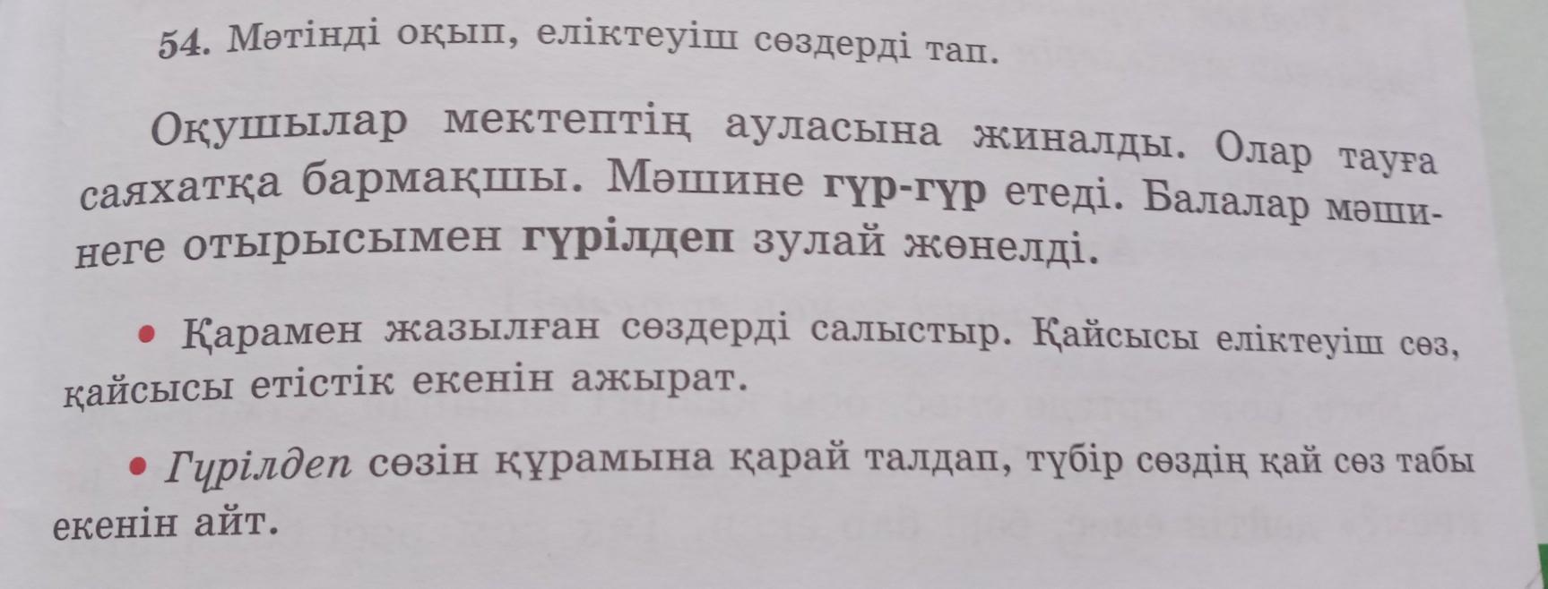 54. Мәтiндi окып, еліктеуіш сөздердi тaп. Окушылар мектептің ауласына жиналды. Олар тауға саяхатқа бармақшы. Мәшине гүр-гүр етеді. Балалар мәшиненеге отырысымен гүрілден зулай жонелдi.