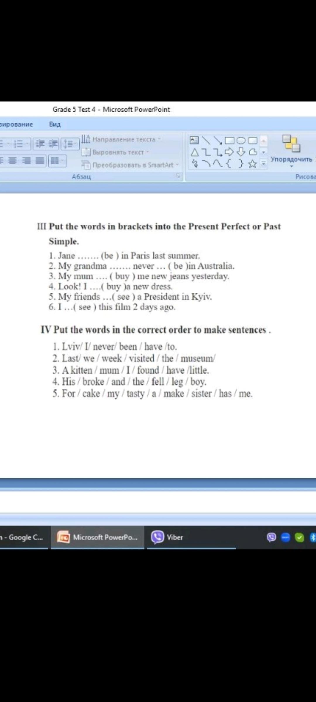 III Put the words in brackets into the Present Perfect or Past Simple.