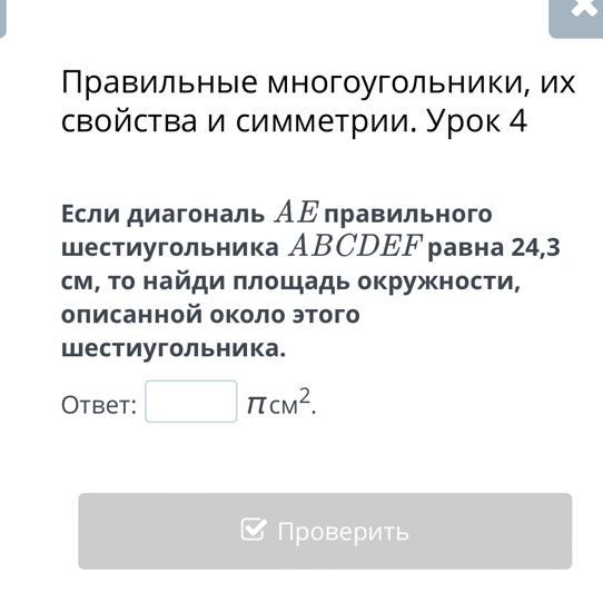 Если диагональ AE правильного шестиугольника ABCDEF равна 24,3 см, то найди площадь окружности, описанной около этого шестиугольника.