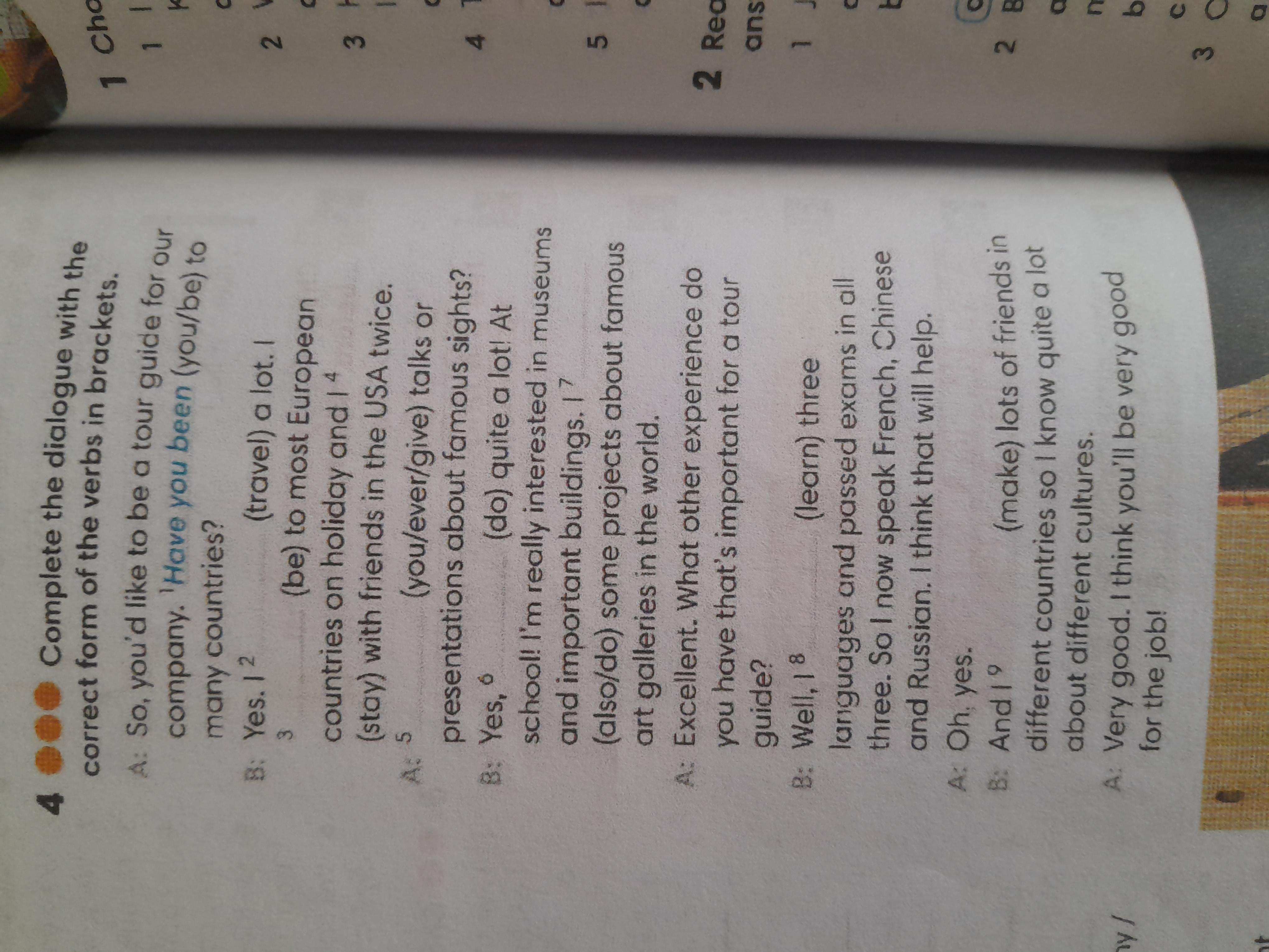 A: So, you'd like to be a tour guide for our company. Have you been (you/been) to many countries? (Have you traveled) a lot. I (have been) to most European countries on holiday and (have stayed) with friends in the USA twice. (Have you ever given) talks or presentations about famous sights? (I have done) quite a lot!