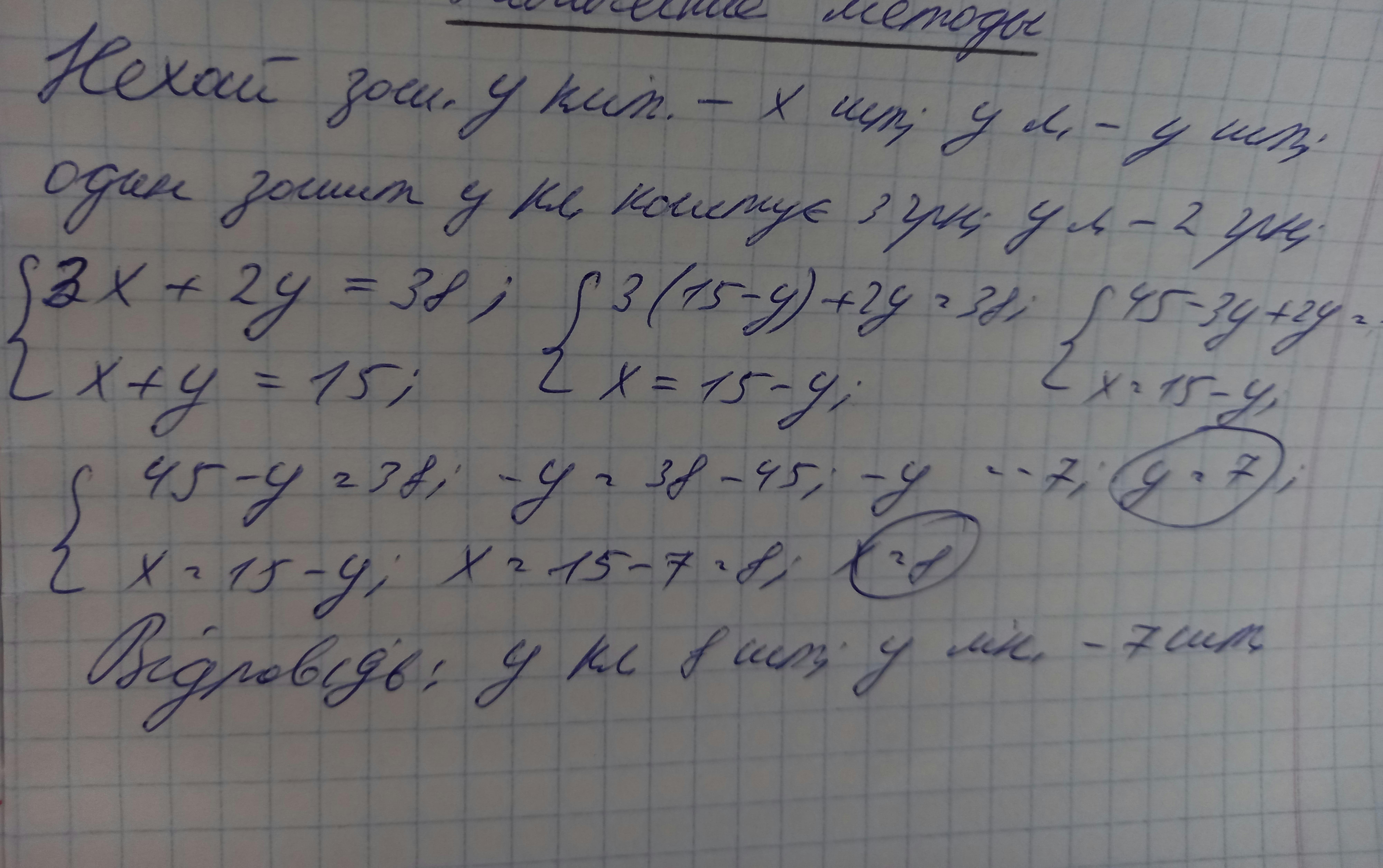 1452. Купили 15 зошитів. З них кілька зошитів у лінійку за ціною 2 грн, а решта - у клітинку за ціною 3 грн. Скільки купили зошитів У лінійку і скільки в клітинку, якщо за покупку заплатили 38 грн?