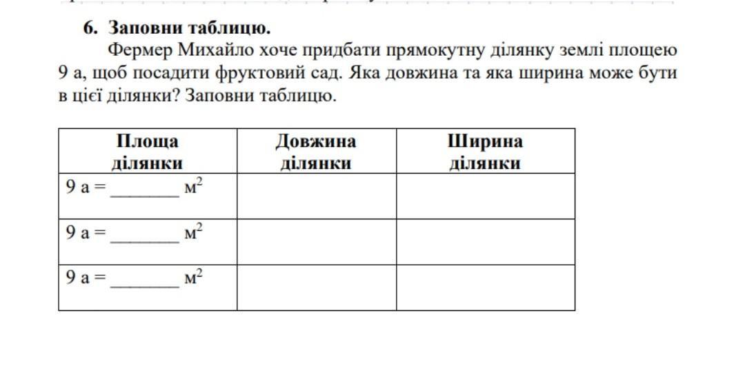 6. Заповни таблицю. Фермер Михайло хоче придбати прямокутну ділянку землі площею 9 а, щоб посадити фруктовий сад. Яка довжина та яка ширина може бути в цієї ділянки? Заповни таблицю. 9 a= 9 a= 9 a= Площа ділянки M² M² м² Довжина ділянки Ширина ділянки
