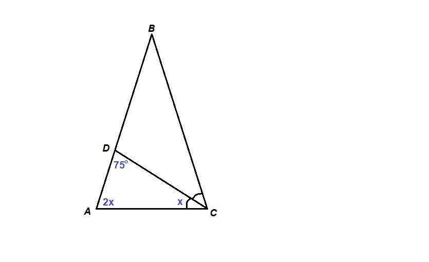 В равнобедренном треугольнике ABC с основанием AC проведена биссектриса CD. найти углы треугольника ABC, если угол ADC равен 75(градусов)