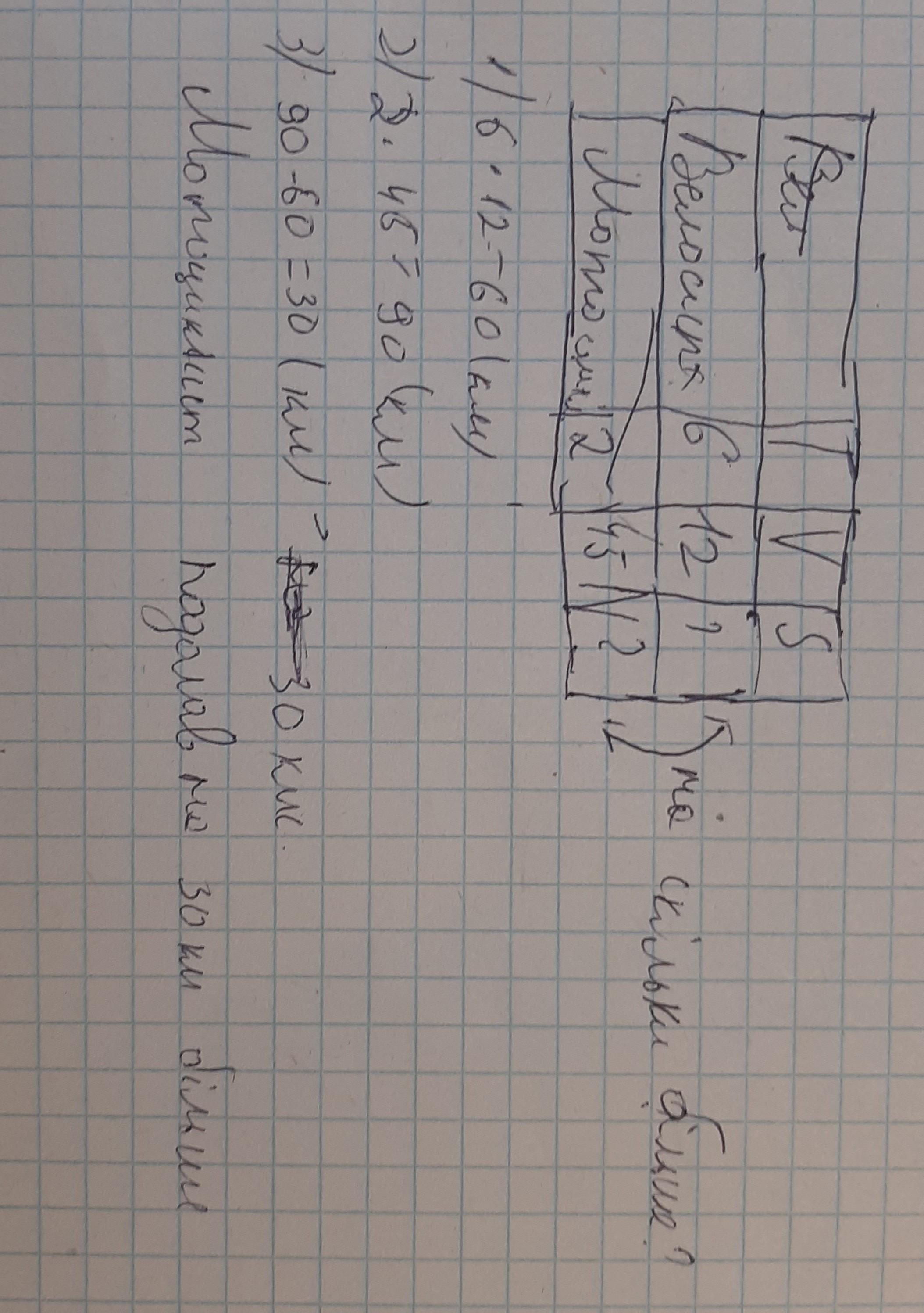 Велосипедист був у дорозі 6 год, а мотоцикліст – 2 год. Хто з них подолав більшу відстань і на скільки, якщо велосипедист їхав зі швидкістю 12 км/год, а мотоцикліст – 45 км/год?