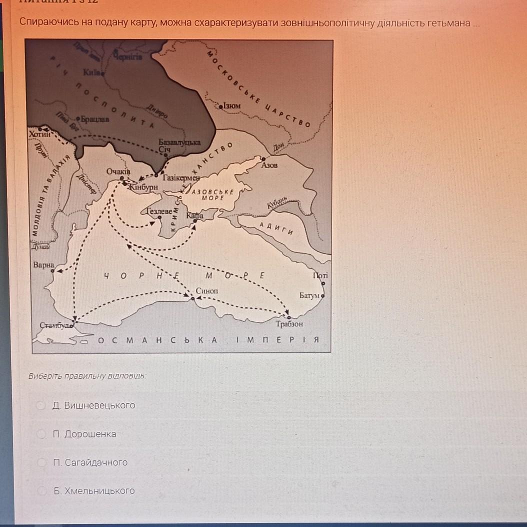Пояснення: Головні ознаки того, що на карті зображена зовнішньополітична діяльність Петра Сагайдачного - це похід на Хотин, позначення Базавлуцької Січі, що обмежує час діяльності гетьмана 1593-1638 роками, та численні морські походи, серед яких - похід на Варну.