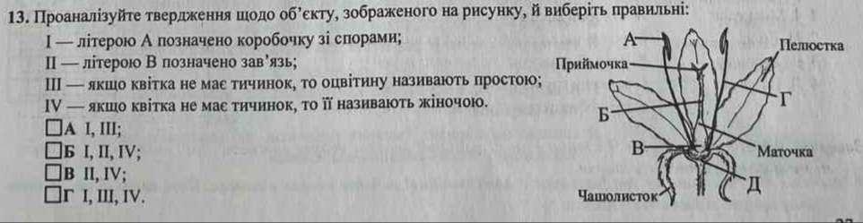 В: II (літерою В позначено зав'язь), IV (якщо квітка не має тичинок, то її називають жіночою)
