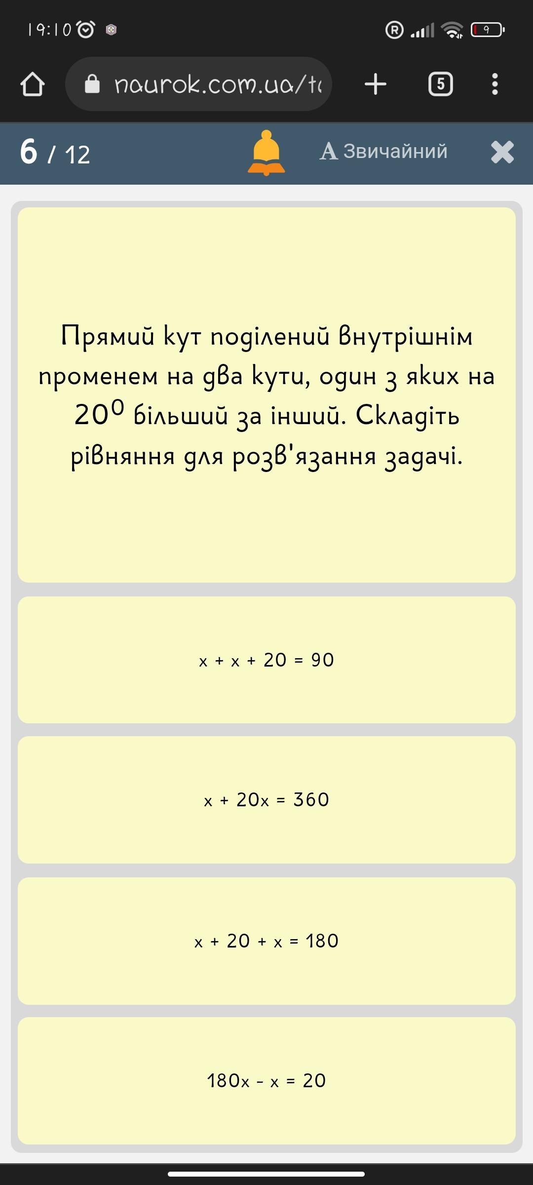 Позначимо перший кут за x, а другий за "x + 20", так як за умовою він на 20° більший за інший.