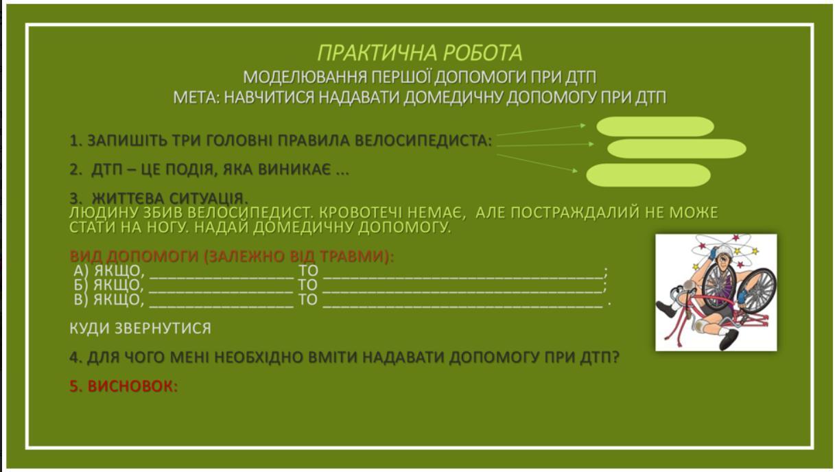 Висновок полягає в тому, що знання та навички надання допомоги при ДТП є важливими для того, щоб зменшити наслідки травм та зберегти життя. Кожен з нас може стати свідком такої події, тому важливо знати, як правильно діяти у випадку надання допомоги. Інвестиція часу та зусиль у навчання надання першої медичної допомоги може мати життєво важливий вплив на життя інших людей.