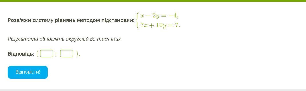 Розв'яжи систему рівнянь методом підстановки:{x−2y=−4,7x+10y=7.