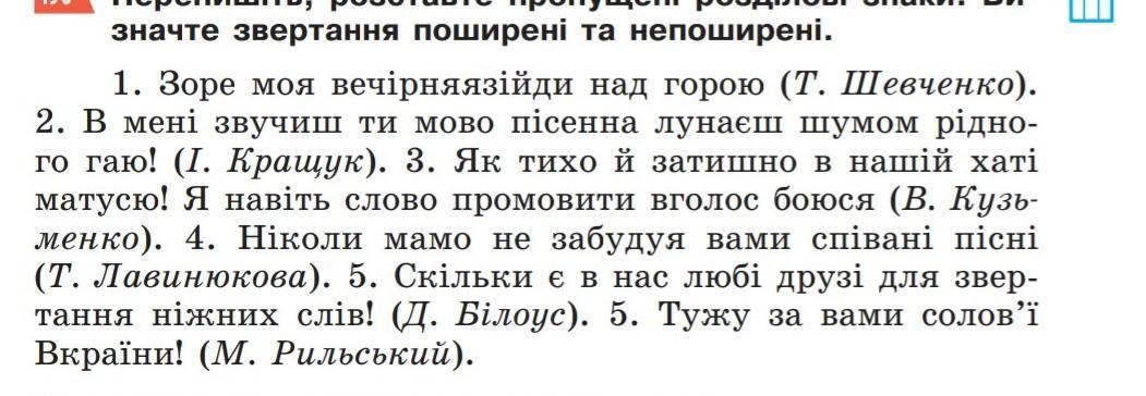 490 Перепишіть, розставте пропущені розділові знаки. Ви- значте звертання поширені та непоширені. 1. Зоре моя вечірняязійди над горою (Т. Шевченко). 2. В мені звучиш ти мово пісенна лунаєш шумом рідно- го гаю! (І. Кращук). 3. Як тихо й затишно в нашій хаті матусю! Я навіть слово промовити вголос боюся (В. Кузь- менко). 4. Ніколи мамо не забудуя вами співані пісні (Т. Лавинюкова). 5. Скільки є в нас любі друзі для звер- тання ніжних слів! (Д. Білоус). 5. Тужу за вами солов'ї Вкраїни! (М. Рильський).