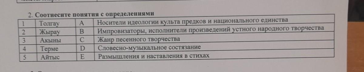 2. Соотнесите понятия с определениями 1 Толгау 2 Жырау A 3 Акыны 4 Терме ul 5 Айтыс В Носители идеологии культа предков и национального единства Импровизаторы, исполнители произведений устного народного творчества Жанр песенного творчества с D Словесно-музыкальное состязание E Размышления и наставления в стихах