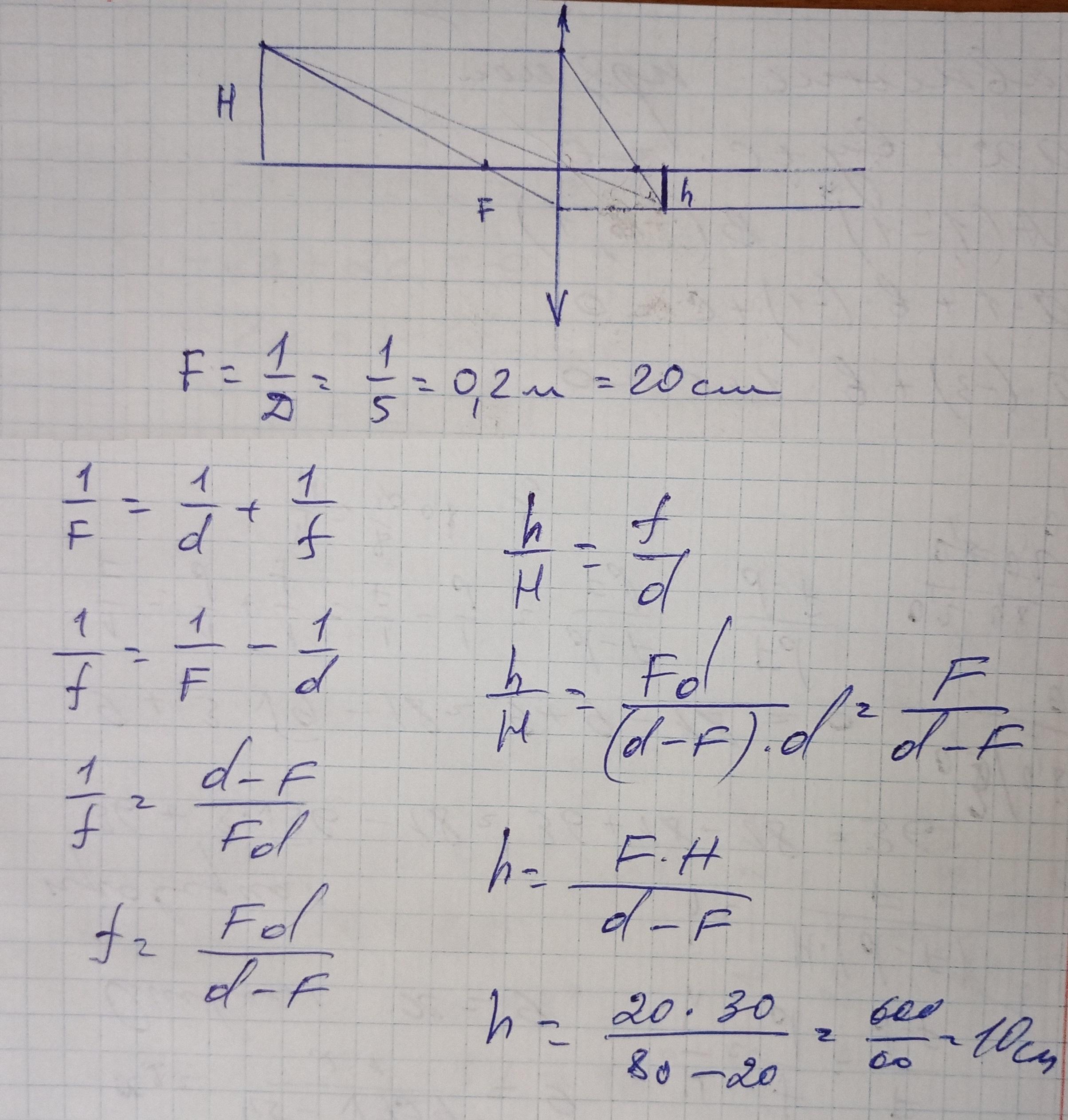 Задание 2. Предмет высотой 30 см расположен вертикально на расстоянии 80 см от линзы с оптичес кой силой 5 дптр. Определить положение изображения и его высоту