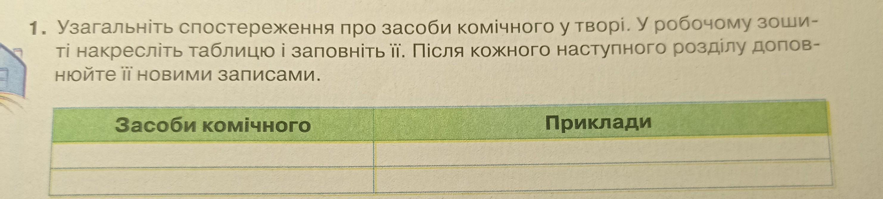 1. Узагальніть спостереження про засоби комічного у творі. У робочому зоши- ті накресліть таблицю і заповніть її. Після кожного наступного розділу допов- нюйте її новими записами.