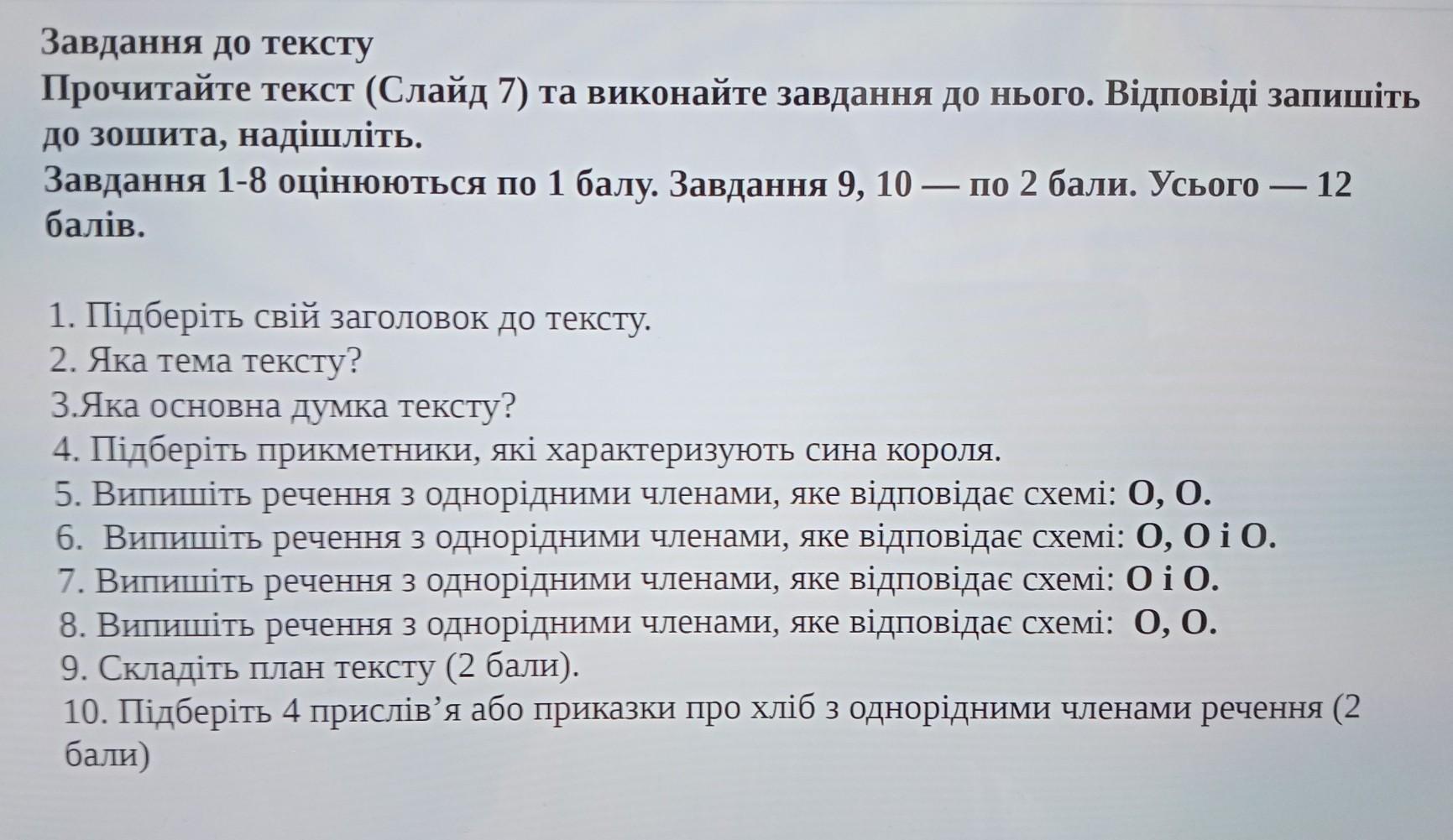 СРОЧНО!!!! - Був один король. Нічого не робив, лише воював з іншими королями й збирав у свої скарбниці золото. Якось розговорився вiн iз мудрецем про те, без чого на свiтi не прожити. Король каже, що без золота, без грошей. А мудрець каже, що без хліба. Король не погодився, бо нібито хліб за гроші не купують. Вирiс того короля син і захотів сам володіти багатствами батька. Коли король перемiряв золото в скарбниці, син замкнув на ній двері, а себе оголосив королем. Старий король стукав у двері, доки не вибився із сил. Золото в нього було, а ïсти за нього не міг купити. Доки жив, доти писав на > дверях: Я вам кажу: не ми хліб носимо, а хліб - нас. (112 cЛ.) (із притчi)