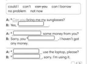 6 Complete the dialogues with the words and phrases in the box. could I can't can you can I borrow no problem not now A: Can you bring me my sunglasses? B: Yes, A: ¹ B: Sorry, you any money. A: B: 9 some money from you? _.I haven't got use the laptop, please? sorry. I'm using it. 0/0