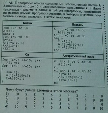Заметим, что переменная k здесь бесполезна - ей присваивают какие-то значения, а потом ничего с ними не делают. Тогда про неё можно забыть. Остаётся только одна команда: A[i] = A[10-i]