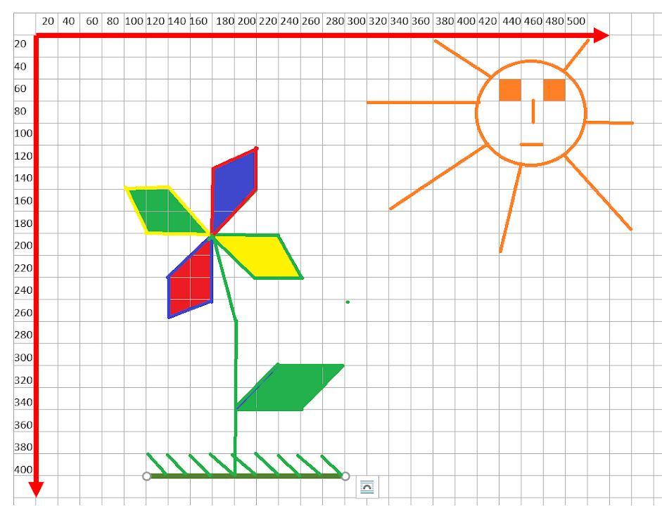 Цей код додає дві додаткові лінії для стебла квітки, два додаткові трикутники для листків, два додаткові малинові прямокутники для квіткових пелюсток, два додаткові жовті трикутники для середини квітки і два додаткові білі овали для малюнка на кінчиках пелюсток. Ви можете експериментувати з цим кодом, щоб змінити розмір, кольори та форму квітки.