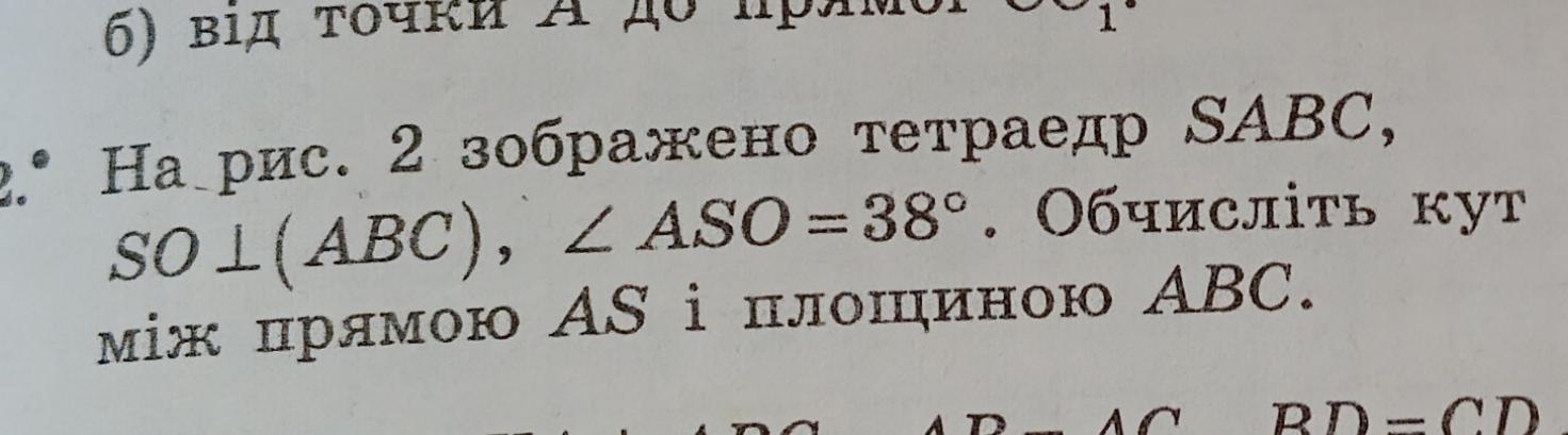 тетраедр SABC SO альфа (ABC) - ASO=38°. Обчисліть кут між прямою AS і площиною ABC