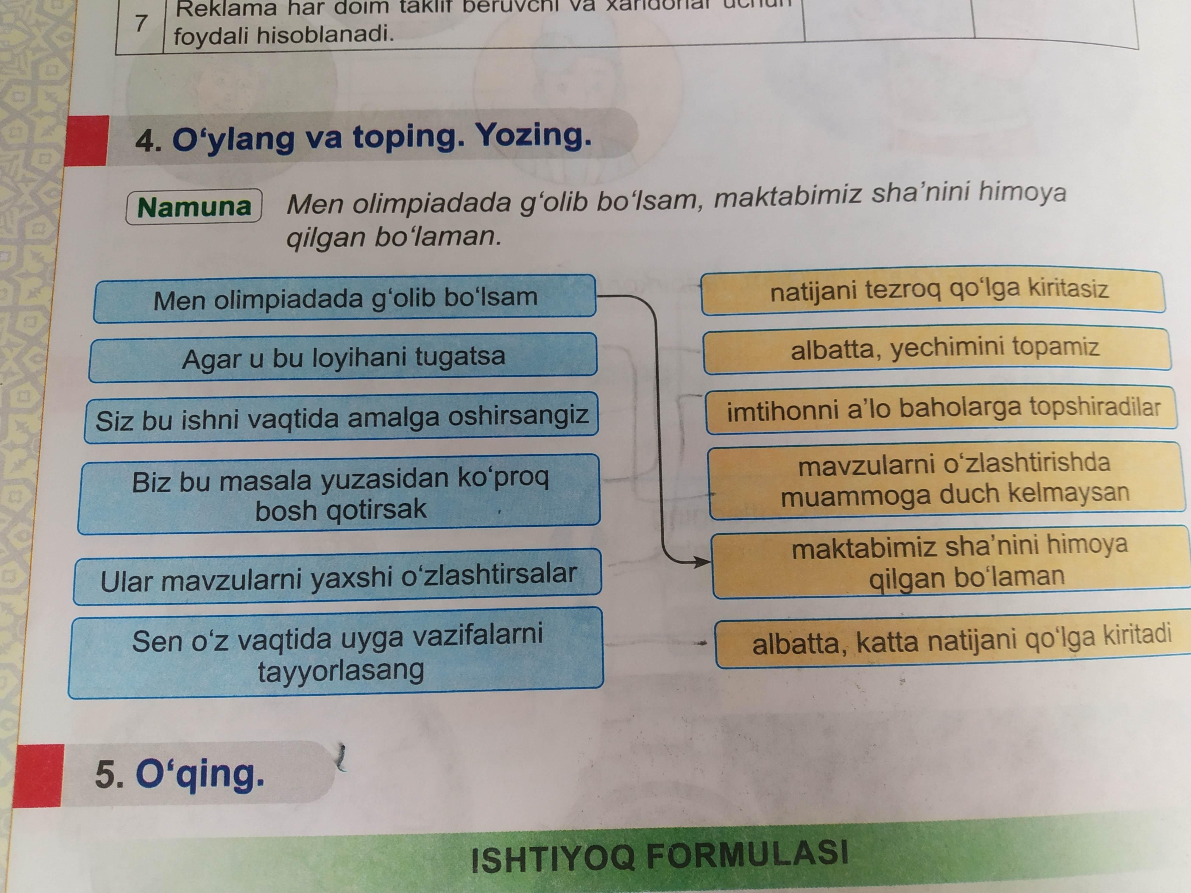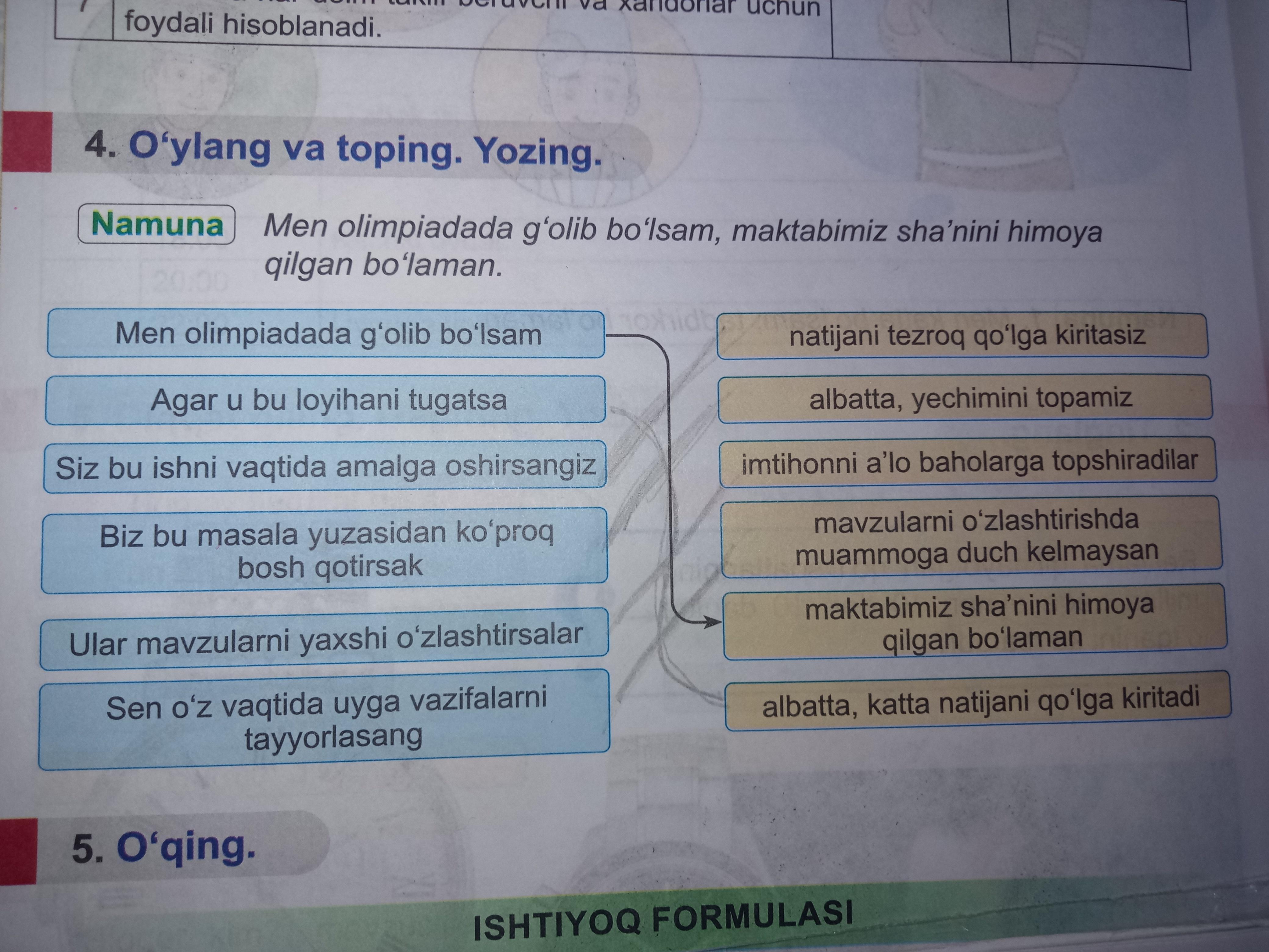 4-topshiriq.O'ylang va toping.Yozing.Men olimpiadada go'lib bo'lsam, maktabimiz sha'nini himoya qilgan bo'laman.