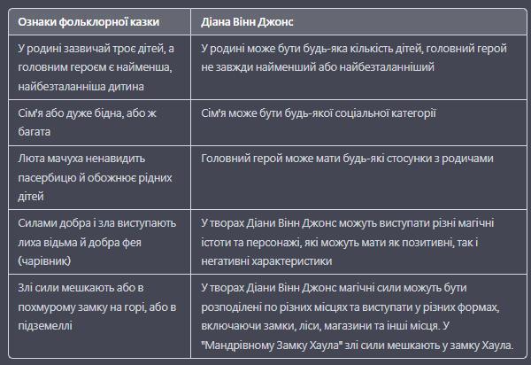 ТЕРМІНОВО!!!!! відсторонив гіацинтів». 3. Заповни таблицю, зіставляючи ознаки фольклорної казки та Діани Вiнн Джонс. Народна казка У родині зазвичай троє дітей, а головним героєм є найменша, найбезталанніша дитина Сім'я або дуже бідна, або ж багата Люта мачуха ненавидить пасербицю й обожнює рідних дітей Силами добра і зла виступають лиха відьма й добра фея (чарівник) відпо- вiдно Злi сили мешкають або в похмурому замку на горі, або в підземеллі запахом особливості твору «Мандрівний Замок Хаула>>