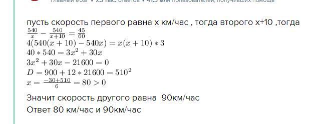 Два автомобиля выехали одновременно из пункта А в пункт В, расстояние между которыми 540 км. Первый автомобиль ехал со скоростью, на 10 км/ч большей, чем второй, и прибыл в пункт В на 45 мин раньше второго. Найдите скорость каждого автомобиля.