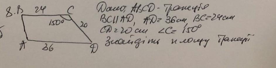 S = ((BC+AD):2)*CO=((24+36):2)*10=(60:2)*10=30*10=300см