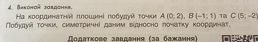 Для побудови точок, симетричних відносно початку координат, ми можемо використовувати властивість симетрії: якщо точка має координати (x, y), то її симетрична точка відносно початку координат матиме координати (-x, -y).