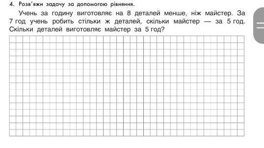 Нехай учень за 1 год виготовляє х деталей, тоді майстер за 1 год виготовляє (х+8) деталей. За 7 год учень виготовить 7х деталей. Майстер за 5 год виготовить: 5(х+8) деталей. За умовою: