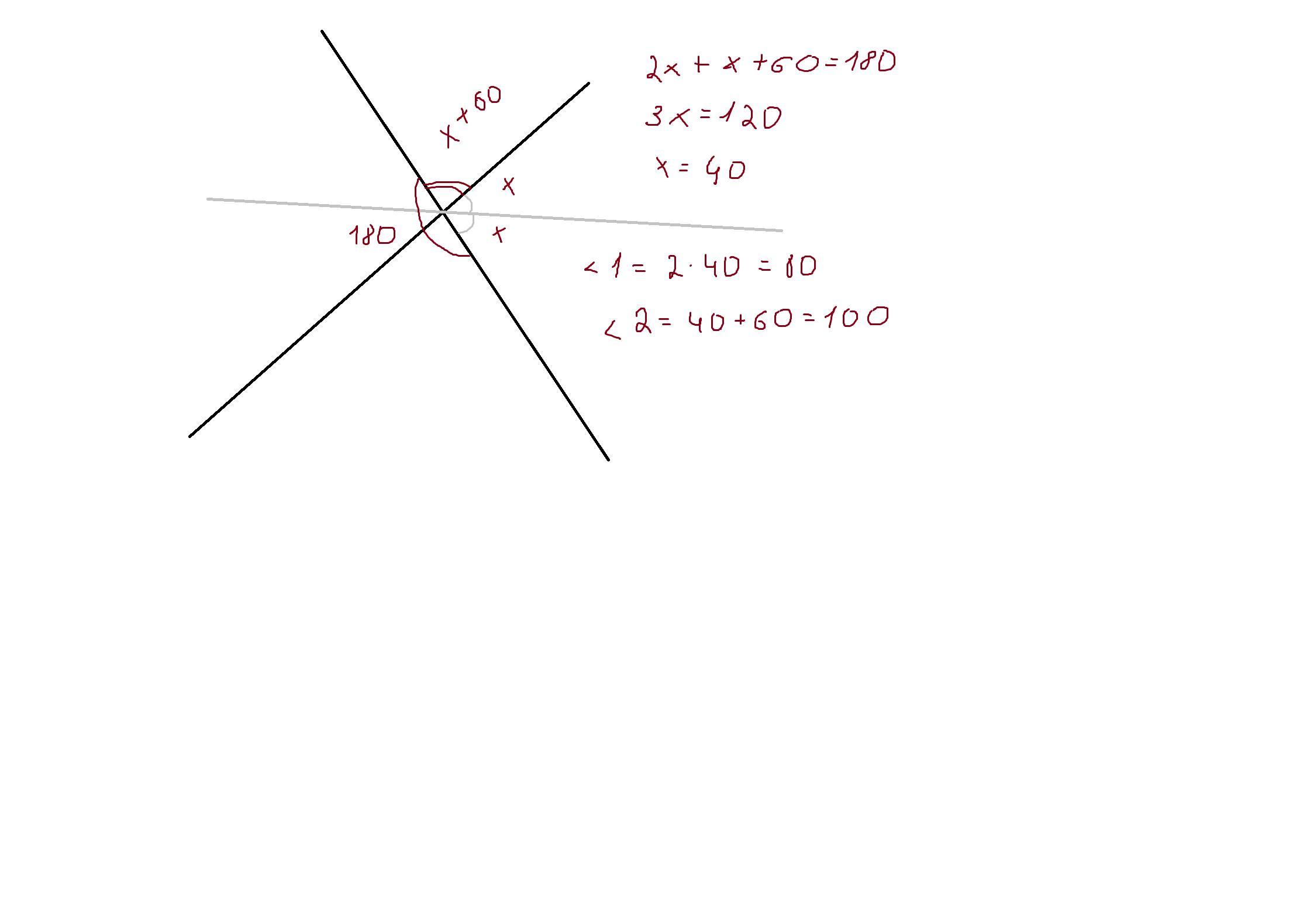 У результаті перетину двох прямих утворилося 4 кути. Знайдіть ці кути, якщо відомо, що один з них більший за половину другого на 60 градусів.