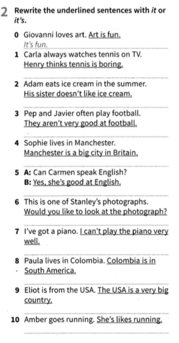1. It's boring. 2. His sister doesn't like it. 3. They aren't very good at it. 4. It's a big city in Britain. 5.She is good at it. 6. Would you like to look at it? 7. I can't play it very good. 8. It's in South America. 9. It's a very big country. 10. She likes it.