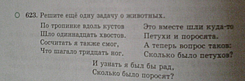 Ответ должен получится: 4 поросёнка, 7 петухов.