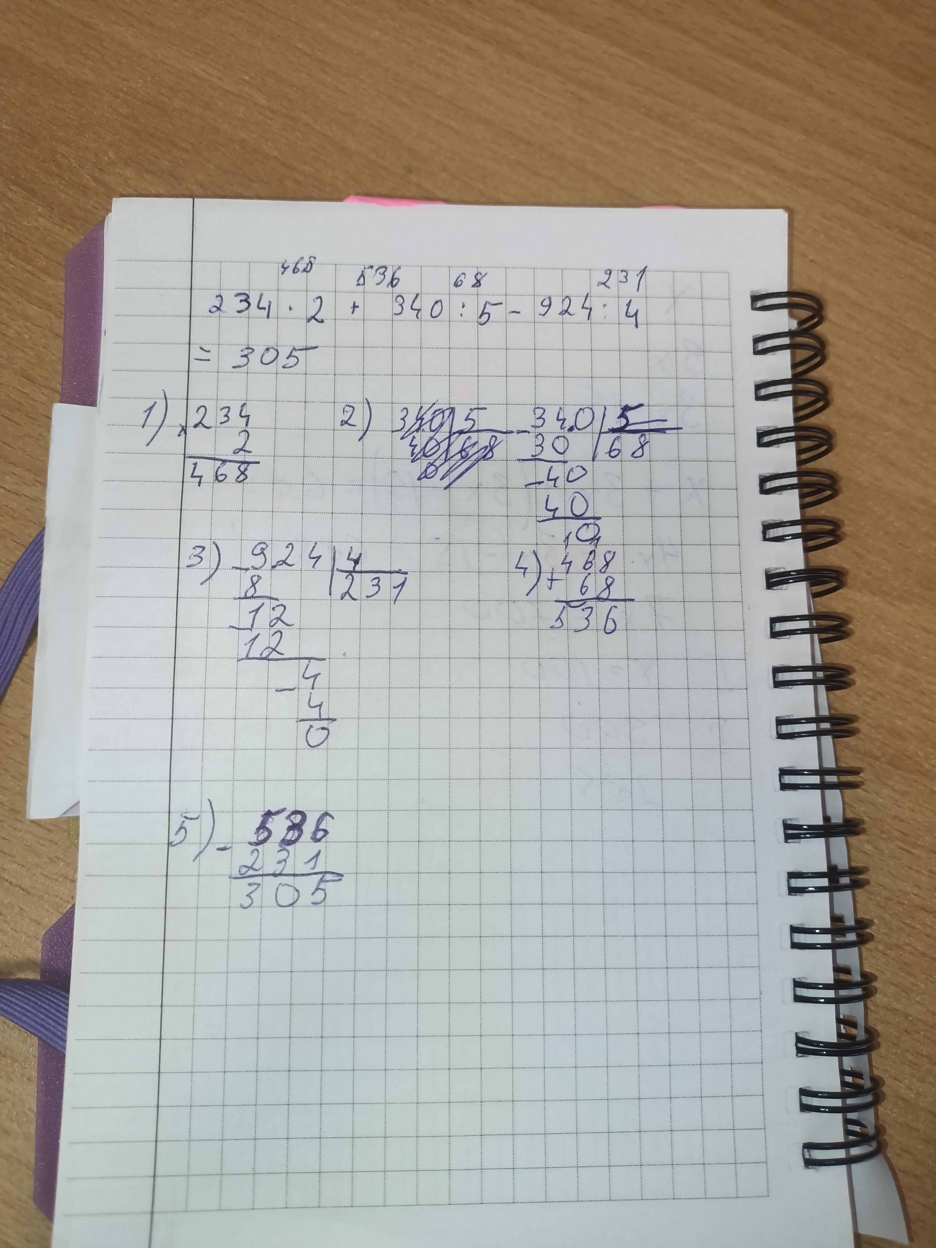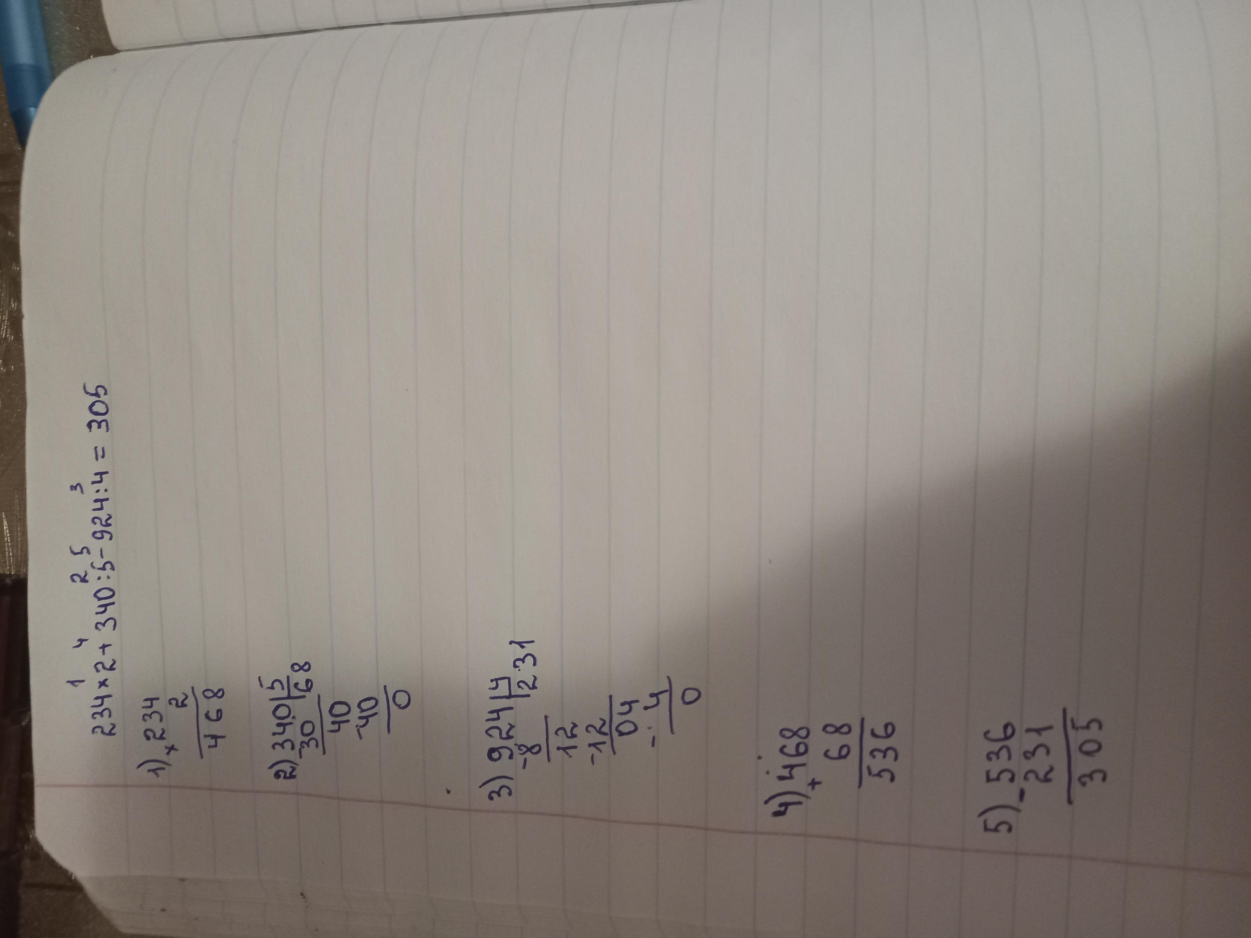 7. Определи порядок выполнения действий и вычисли. 1)234×2+340:5–924:4