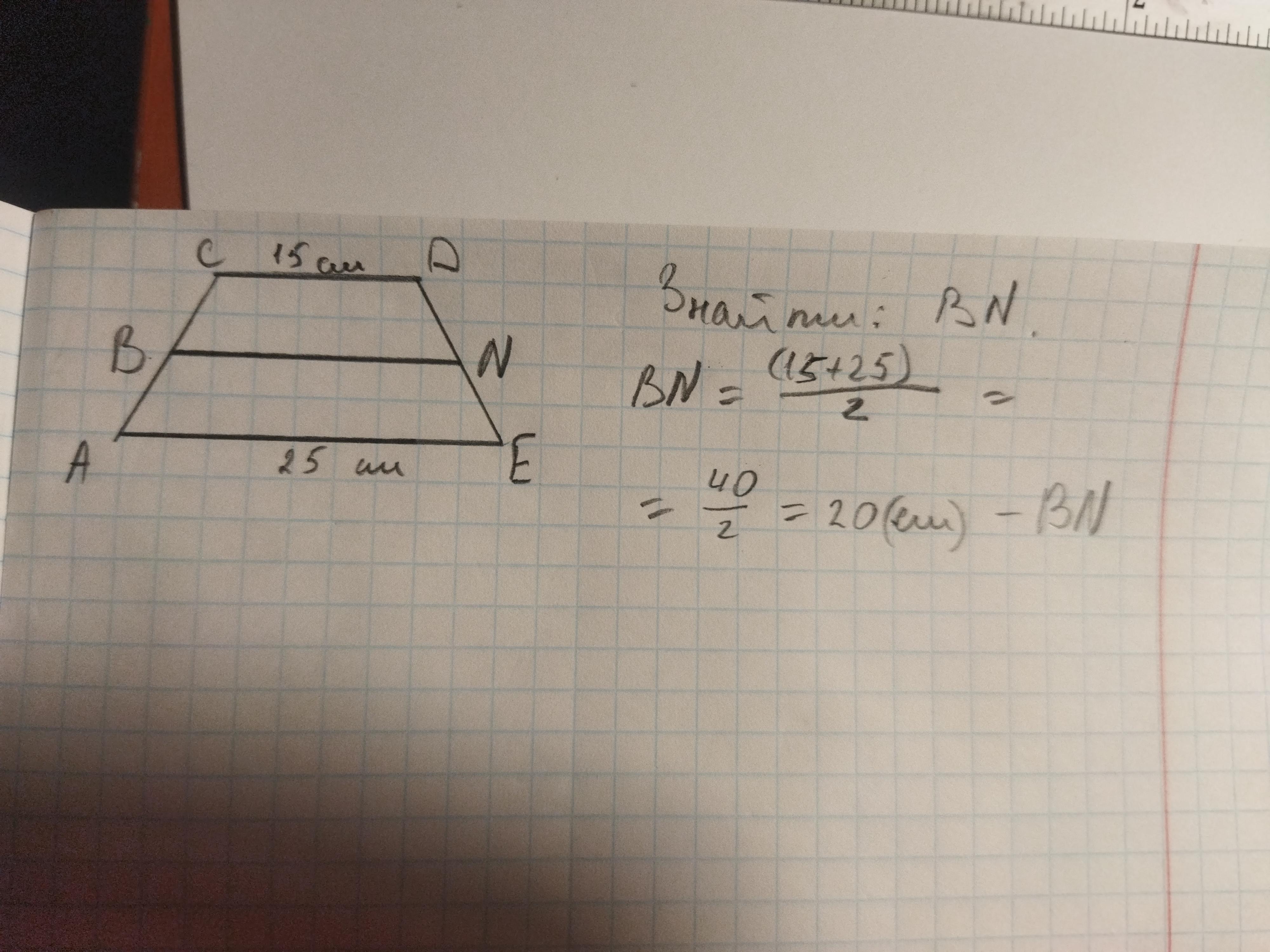 Основи трапеції дорівнюють 15 см та 25 см. Знайти середню лінію трапеції.