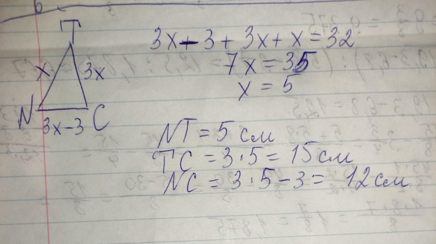 Периметр треугольника NTС равен 32 см. Сторона ТС больше стороны NC на 3 см и больше стороны NT в 3 раза. Найдите длины сторон треугольника