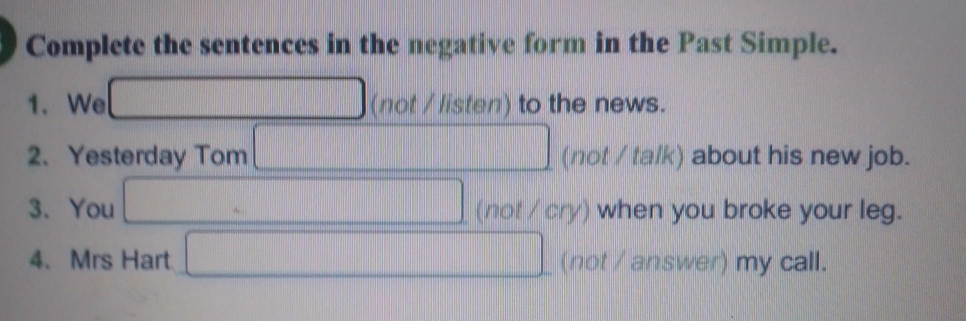B Complete the sentences in the negative form in the Past Simple. 1. Wel 2. Yesterday Tom 3. You 4. Mrs Hart (not/listen) to the news. (not/talk) about his new job. (not/cry) when you broke your leg. (not/answer) my call.