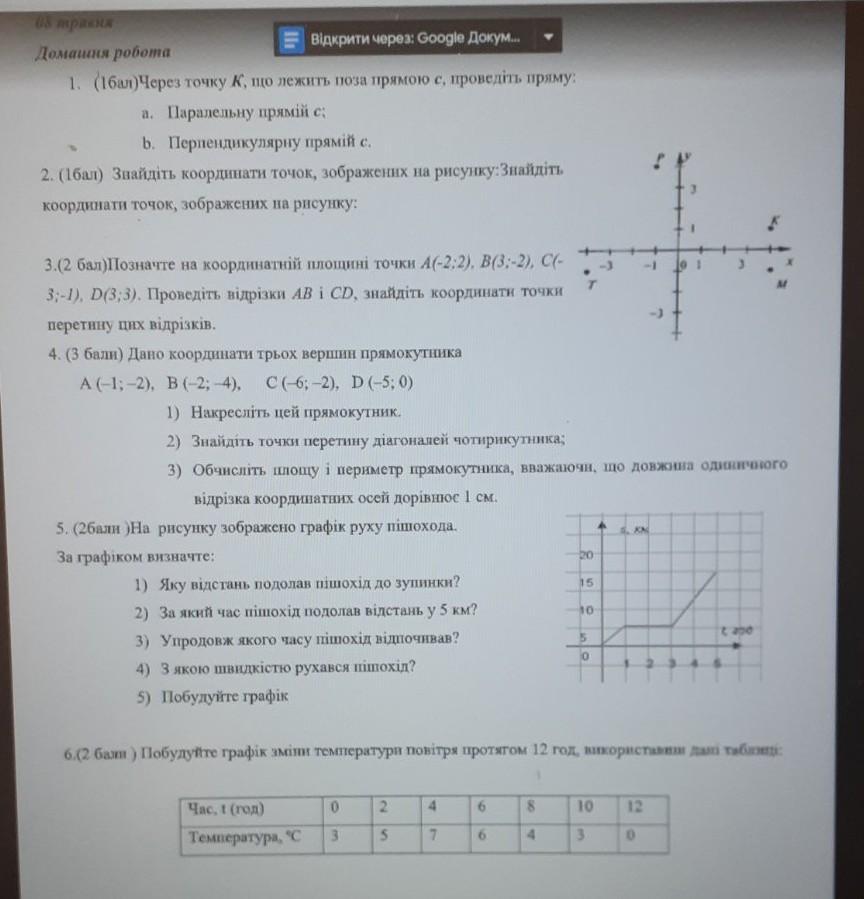 Домашня робота 1. (1бал)через точку К, що лежить поза прямою с, проведіть пряму: а. Паралельну прямій с: ь. Перпендикулярну прямій с. 2. (1бал) Знайдіть координати точок, зображених на рисунку: Знайдіть координати точок, зображених на рисунку: 3.(2 бал)Позначте на координатнiй площинi точки А(-2:2), B(3;-2), C(- 3;-1), D(3:3). Проведіть вiдрiзки AB i CD, знайдіть координати точки перетину цих вiдрiзкiв. 4. (3 бали) Дано координати трьох вершин прямокутника A (-1;-2), B(-2;-4), C(-6;-2), D (-5; 0) 1) Накресліть цей прямокутник. 2) Знайдіть точки перетину діагоналей чотирикутника; 3) Обчисліть площу і периметр прямокутника, вважаючи, що довжина одиничного i вiдрiзка координатних осей дорівнюс 1 см. рисунку зображено графік руху пішохода. 5. (2бали )На За графіком визначте: 1) Яку відстань подолав пішохід до зупинки, 2) За який час пішохід подолав відстань у 5 км? 3) Упродовж якого часу пішохід відпочивав? 4) З якою швидкістю рухався пішохід? 5) Побудуйте графік 0 3 2 5 4 7 6 20 S 4 15 10 6.(2 бали) Побудуйте графік змiни температури повітря протягом 12 год, використаан дан таба Час, 1 (год) Температура, С 5 0 10 5. N 3 t 20 12 0
