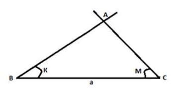 Малюємо відрізок, рівний довжині сторони трикутника. До кінця відрізка прикладаємо транспортир і по ньому відзначаємо точкою перший кут. Також зазначаємо другий кут у другого кінця відрізка.