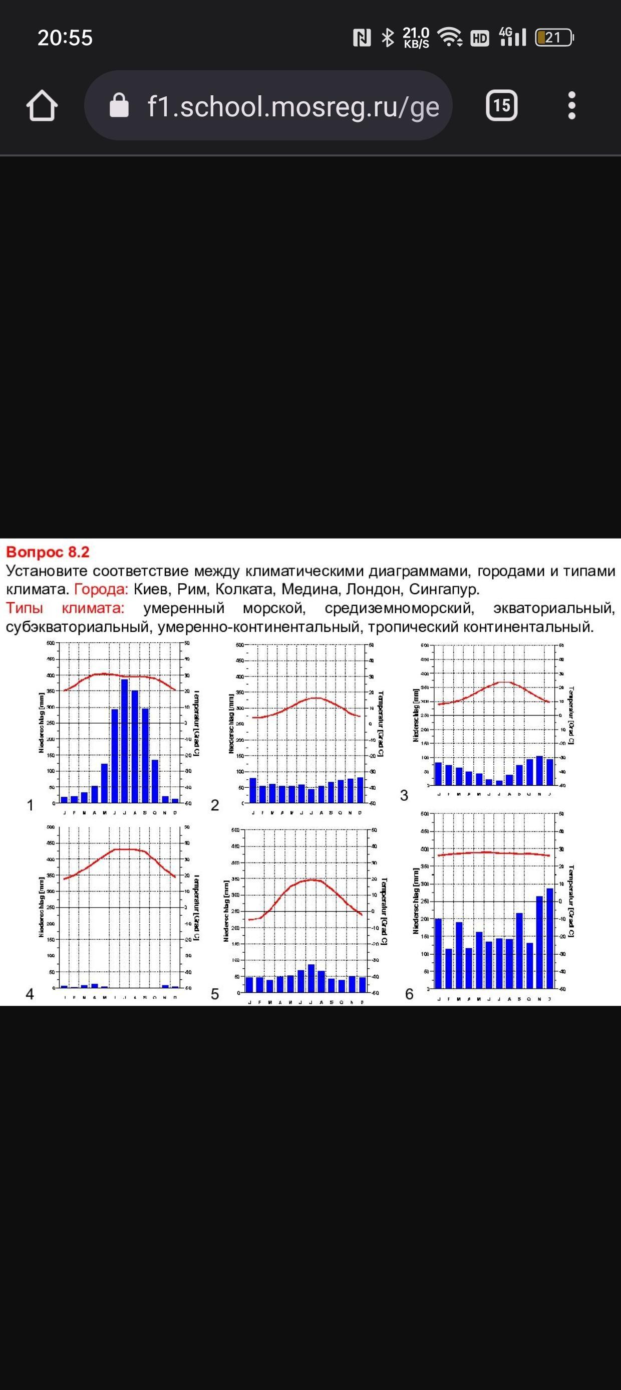 Установите соответствие между климатическими диаграммами городами и типами климата. Города: Киев, Рим, Колката, Медина, Лондон, Сингапур Типы климата: умеренный, морской, средиземноморский, экваториальный, субэкваториальный, умеренно-континентальный, тропический континентальный
