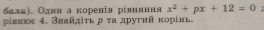 4). Один з коренів рівняння х2 + рx + 12 = 0 нює 4. Знайдіть р та другий корінь.