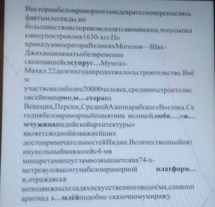 1. Озаглавьте текст, определите основную мысль 2. Разделите на абзацы. Составьте план. 3. Ответьтена вопросы к тексту. А) Когда был созданбеломраморный шедевр? Б) В чью честь была построенаусыпальница? В) Сколько лет продолжалось строительство? г) Вкакой страневоздвигнут памятниквеликойлюбви? Д) Как выглядитмавзолейТадж-Махал? 4. Выпишите из текста слова с пропущенными буквами, распределяя их на две колонки: 3 слова с пропущенной гласной в корне (подобрать проверочное слово, выделить корень, поставить ударение) и 3 слова с пропущенной гласной в окончании (выделить окончание, определить склонение и падеж).