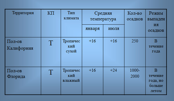 Вывод: Несмотря на одинаковое широтное положение, п-ова Калифорния и Флорида имеют существенное отличие в климате. Это связано с течениями, преобладающими направлениями ветров и рельефом подстилающей поверхности Эти два полуострова расположены на одной широте, в одном климатическом поясе (КП) - тропическом, но значительно отличаются по температуре воздуха и количеству осадков.