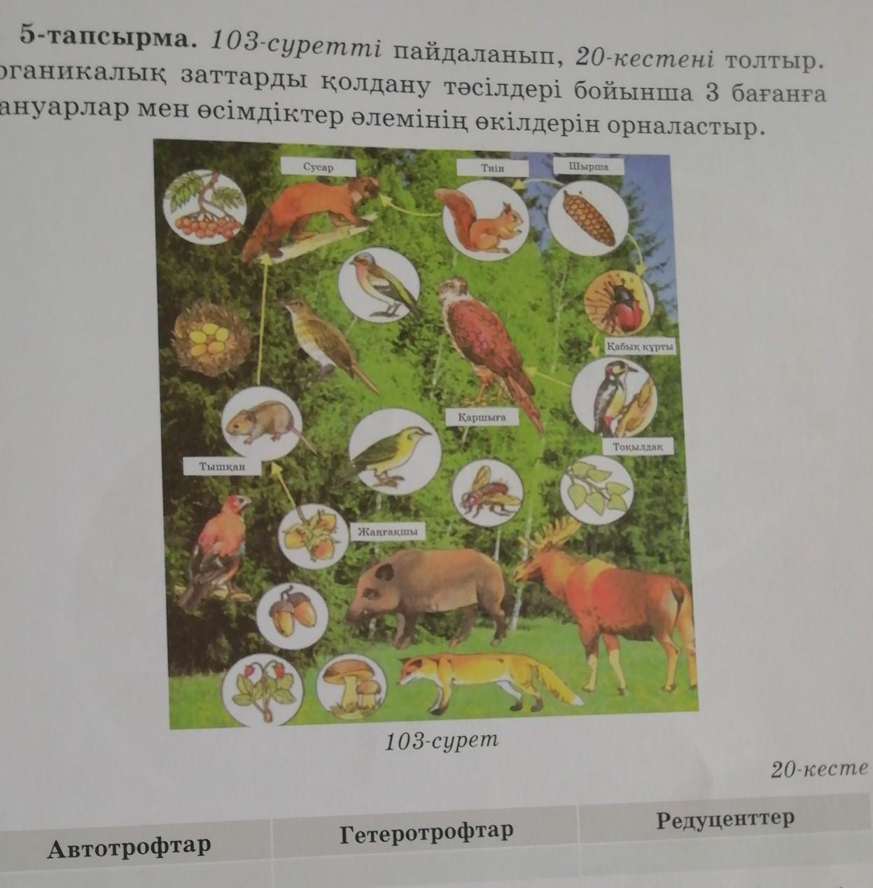 5-тапсырма 103-суретті пайдаланып, 20-кестені толтыр. органикалық заттарды қолдану тәсілдері бойынша 3 бағанға жануарлар мен өсімдіктер әлемінің өкілдерін орналастыр. СРОЧНО