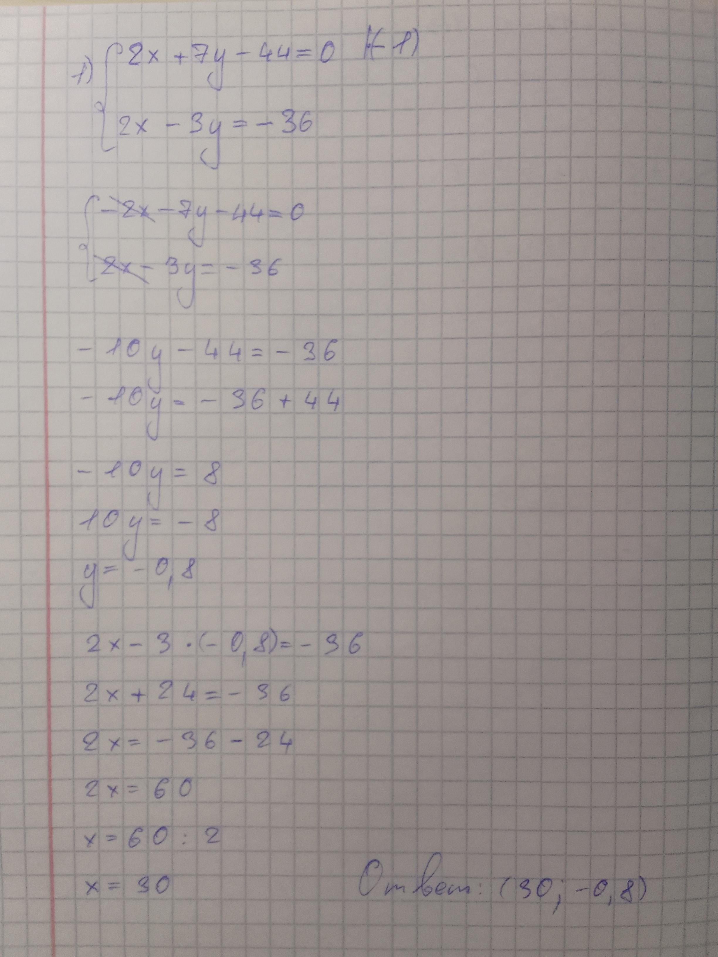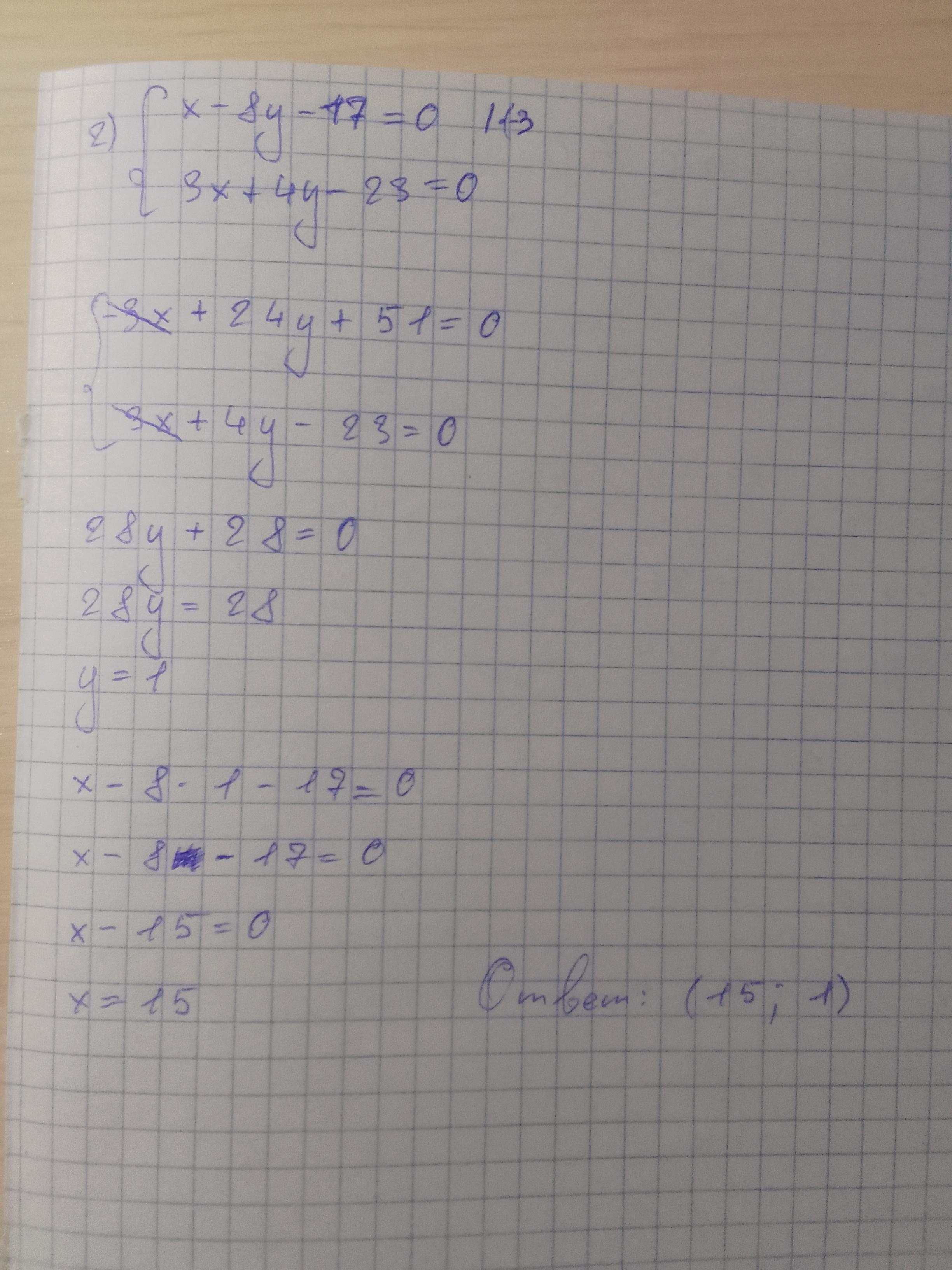 В 1474. Решите системы уравнений способом сложения: 1) (2x + 7y-44 = 0, 2x-3y=-36; 2) [x-8y-17 = 0, 3x+4y-23 = 0. ПОМОГИТЕ ПОЖАЛУЙСТА СО 2 УРАВНЕНИЕМ (ДАМ 100 БАЛЛОВ)