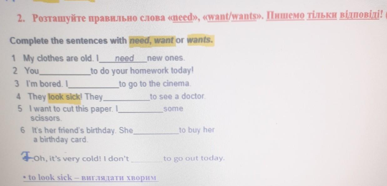 Complete the sentences with need, want or wants. 1 My clothes are old. I 2 You 3 I'm bored. I 4 They look sick! They 5 need new ones. to do your homework today! to go to the cinema. I want to cut this paper. scissors. 6 It's her friend's birthday. She a birthday card. Oh, it's very cold! I don't to see a doctor. some to buy her to go out today. срочьно у меня кр пішем только ответ