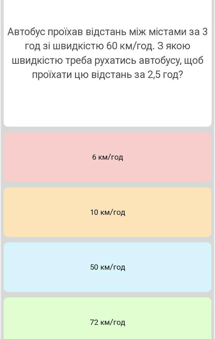 Автобус проїхав відстань між містами за 3 год зі швидкістю 60 км/год. З якою швидкістю треба рухатись автобусу, щоб проїхати цю відстань за 2,5 год?