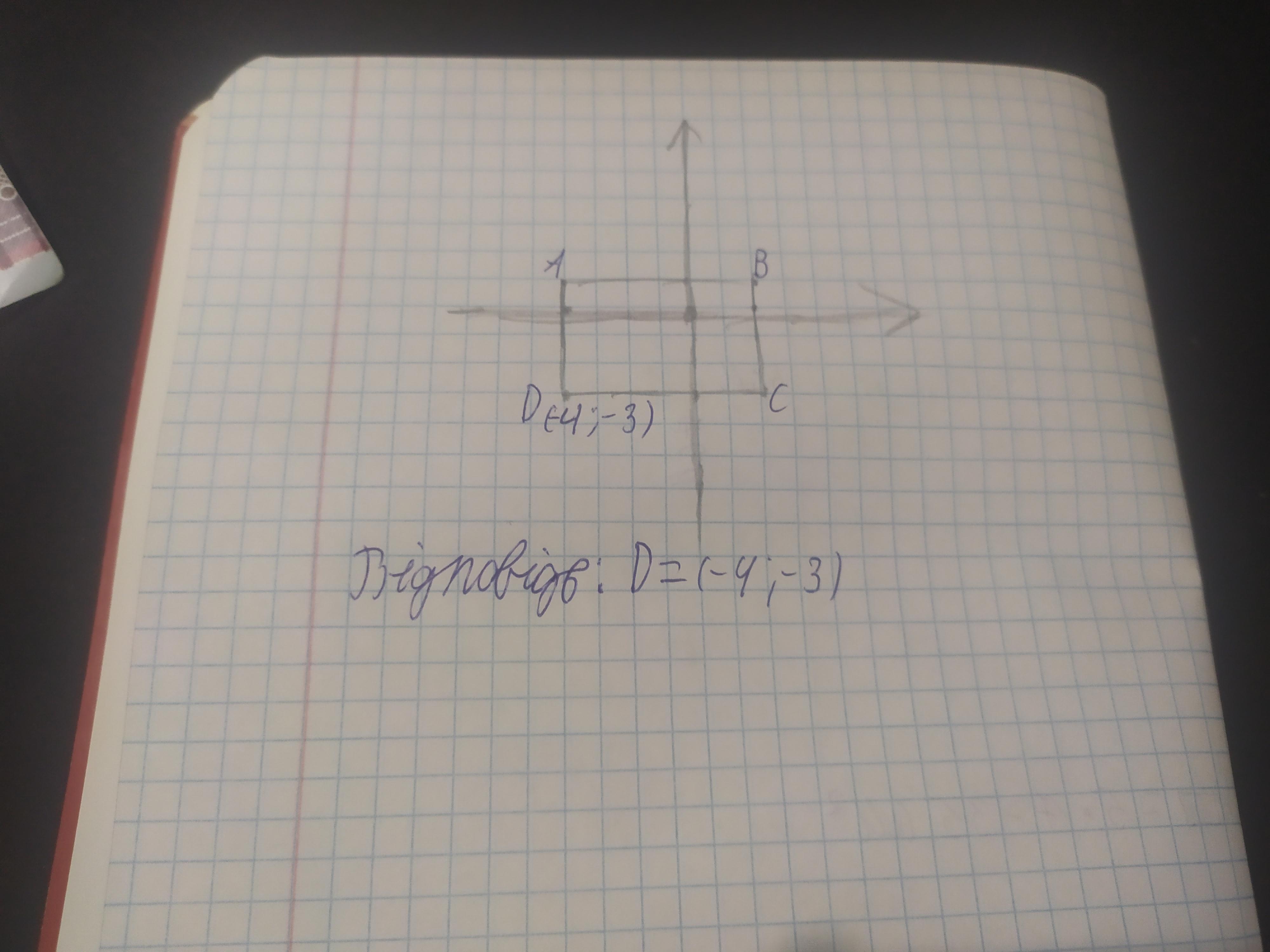 Дано координати трьох вершин прямокутника ABCD: A(-4;1), B(2;1), С(2;-3). Знайди координати точки D. D(3;-4) D(-3;-4) D(-4;-3) D(-4;3) ЗБЕРЕГТИ І ПЕРЕЙТИ ДАЛІ