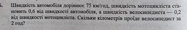 6. Швидкість автомобіля дорівнює 75 км/год, швидкість мотоцикліста ста- новить 0,6 від швидкості автомобіля, а швидкість велосипедиста- -0,2 від швидкості мотоцикліста. Скільки кілометрів проïде велосипедист за 2 год? -