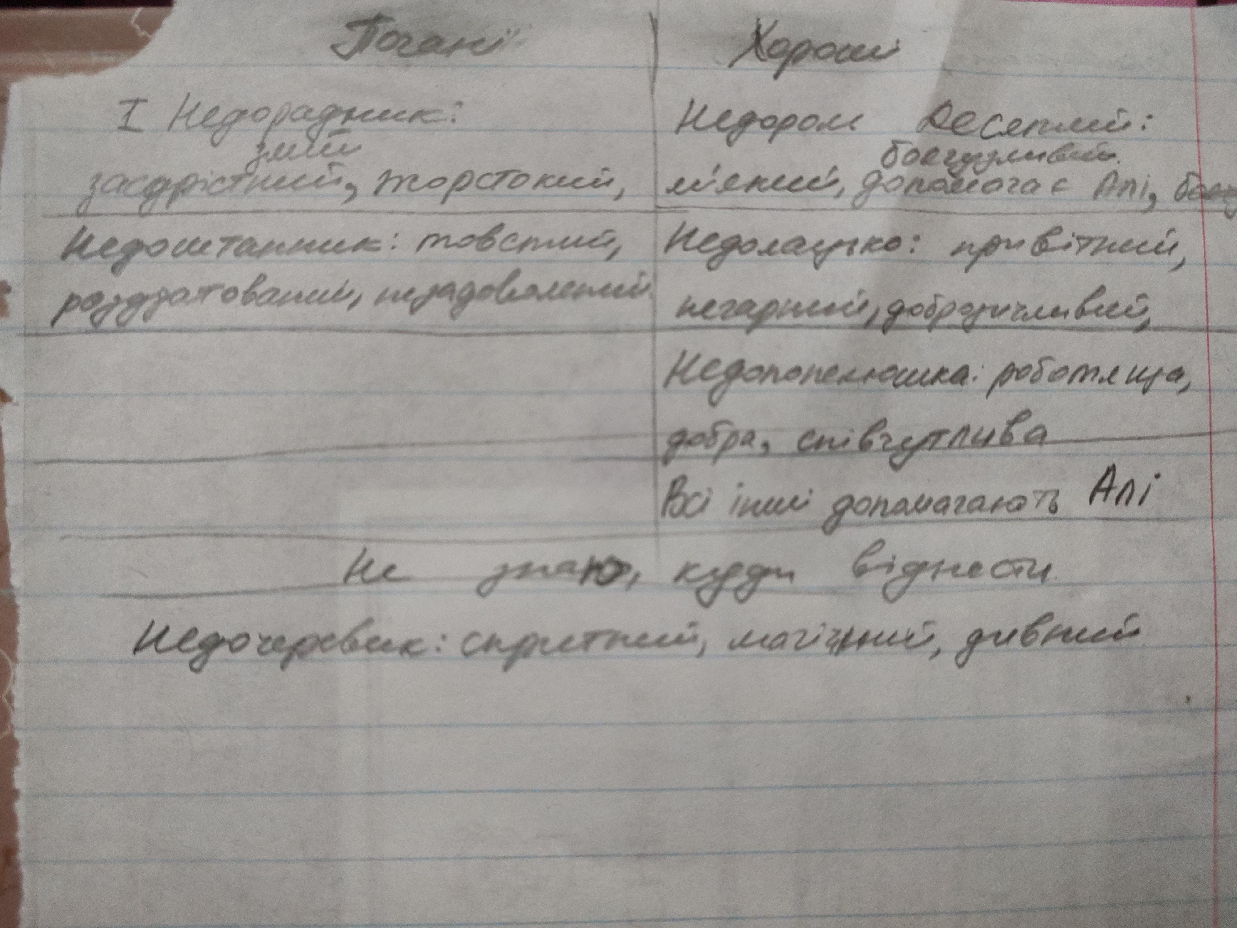 Розподiлiть у два стовпчики героїв iз добрими та злими рисами характеру (з повісті-казки Г. Малик "Незвичайні пригоди Алі в країні Недоладії»). Біля кожного героя запишіть риси його характеру (не менше трьох). ТЕРМІНОВО ЗДАТИ ТРЕБА СЬОГОДНІ!!!!! ДАЮ 50 БАЛІВ!!!